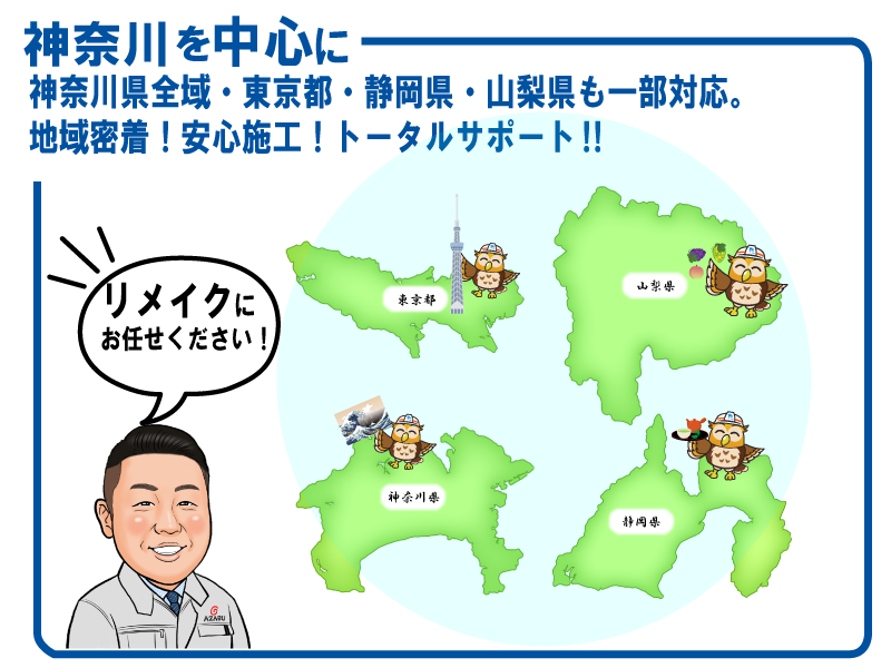 株式会社リメイクは、神奈川県を中心とした近隣地域(静岡、山梨など)まで幅広地域で
