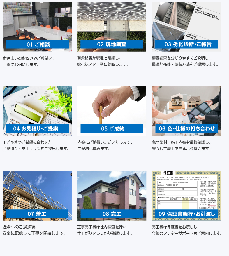 そんな想いで、スタッフ一同、技術の向上とサービスの改善に日々取り組んでいます。大切なお住まいのこと、外壁・屋根・雨漏りのことで気になることがありましたら、どうぞお気軽にご相談ください。