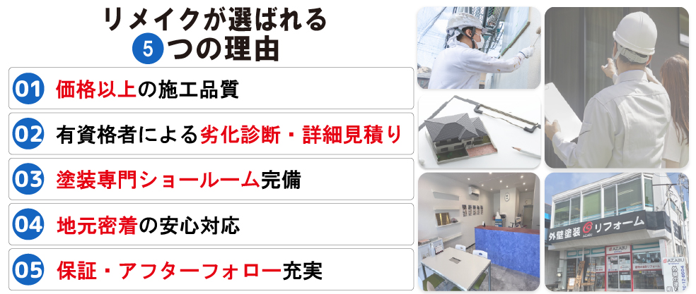 に投稿されました Mika Hijikata2025-08-19Trustindex は、レビューの元のソースが Google であることを確認します。 外壁塗装をお願いしました。 丁寧な作業や仕上がりについては、もちろん大満足ですが、家族で相談したこだわりの色にも対応していただいたり、朝夕の作業の説明も簡潔でわかりやすかったり、全工程、安心して過ごすことができました。 お茶の用意は不要、作業中も不在で構わないということで、仕事にも支障なく、通常通りの生活ができたことも、わが家にとってはとても助かるポイントでした。 ありがとうございました。に投稿されました masataka seita2025-08-13Trustindex は、レビューの元のソースが Google であることを確認します。 前回の塗装から約10年経ったので、今までの白系一色の塗装から、今回グレー系のツートンへ変更しました。ツートン塗装の決定までに何度かシミュレーションしていただき、大変参考になりました。 塗装もすごく丁寧で、近所の方からも”丁寧な塗装屋さんですね”と声を掛けられました。 出来上がりもシックな感じで、とても気に入っています!に投稿されました K2025-07-05Trustindex は、レビューの元のソースが Google であることを確認します。 外壁と屋根の塗装工事が無事に完了いたしました。 暑い中、職人さんが丁寧にやってくださり とても綺麗に仕上がりました。 本当にありがとうございました。に投稿されました Yusuke M2024-11-25Trustindex は、レビューの元のソースが Google であることを確認します。 外壁・屋根の塗装をお願いしました。 こちらの希望を聞いた上で、素人の私にもわかりやすくメリットやデメリットを説明してくださり、塗料の選定や工事の段取りなど安心してお話を進めることができました。 作業に来て下さる職人さんたちは皆さん礼儀正しく、真面目な方々です。また、私は仕事でほぼ家を空けていましたが、「塗り替え交換日記」というもので日々の作業の進捗を報告してくださり、こちらからの要望も記載できるようになっていました(要望するようなことが無くて、何も書きませんでしたが…) 築40年の家がまるで新築のようになり、感激しています。 良くない塗装業者さんもいると耳にしますが、地域密着で真面目にやられているリメイクさんは、間違いなく安心して任せられる業者さんです。 今後の点検や次回の塗り替えもよろしくお願いします!に投稿されました しーばす2024-06-15Trustindex は、レビューの元のソースが Google であることを確認します。 前回の屋根、外壁塗装工事から11年を経過し、そろそろ最後の塗装工事と考え、15年間程度の耐久性と夏の暑さを緩和できる塗装剤として省エネ大賞を受賞したGAINAを選択しました。 リメイクさんとは特にお付き合いがなかったものの、見積依頼して、そのフットワークの良さと屋根、外壁の欠陥点や塗装個所毎の施工方法を写真を交えた見積書をいただき、塗装専門店としての質の高さを感じました。 施工中も職人さんから毎日報告書をいただき、また私の疑問点にも丁寧に答えていただき、安心して仕事を任せられました。 施工後は、新築と見間違いする出来栄えで、また、きっちりした完了報告書や保証書をいただき、その上数年ごとのアフターケアもしていただけるそうで、本当に施工して良かったです。 今は、この夏の暑さがどのくらい過ごし易くなるのか楽しみにしています。に投稿されました 森下工務店森下2024-04-18Trustindex は、レビューの元のソースが Google であることを確認します。 雨漏り調査でお世話になっています。 原因を必ず見つけて頂けるのでとても助かっております。に投稿されました 滝沢正二2023-12-18Trustindex は、レビューの元のソースが Google であることを確認します。 プロ意識の高さと・誠実で笑顔の対応・最高でした! 塗る前のシュミレーションのイメージ画像での確認・見積書や 完成報告書は写真入りで、とても分かりやすく良かったです。 客商売のため車の出入りが多く大変だったと思いますが、比較的 若い社員にもかかわらず、仕事始まりや作業中・帰る時なども 礼儀正しく・気持ちよく・笑顔の対応で・色あせた看板も 塗っていただき、仕上がりにはとても満足しています。 今回リメイクさんに頼んで良かったと思っています。 また機会がありましたらお願いしたいと思っておりますので 今後ともよろしくお願いいたします。に投稿されました 大倉敦子2023-08-20Trustindex は、レビューの元のソースが Google であることを確認します。 技術士さんがいる確かな自信がありながらもあくまでも謙虚な営業姿勢、ひきつけられました。 現場の方の気付きも素晴らしく、塗装の費用しかお支払していないのに細かな補修をしてくれてあって、本当に嬉しい驚きで、いっぱいでした。 リメイクさんにお願いして、良かったです😊に投稿されました Hiro Ino2023-08-03Trustindex は、レビューの元のソースが Google であることを確認します。 外壁塗装、屋根塗装およびベランダ防