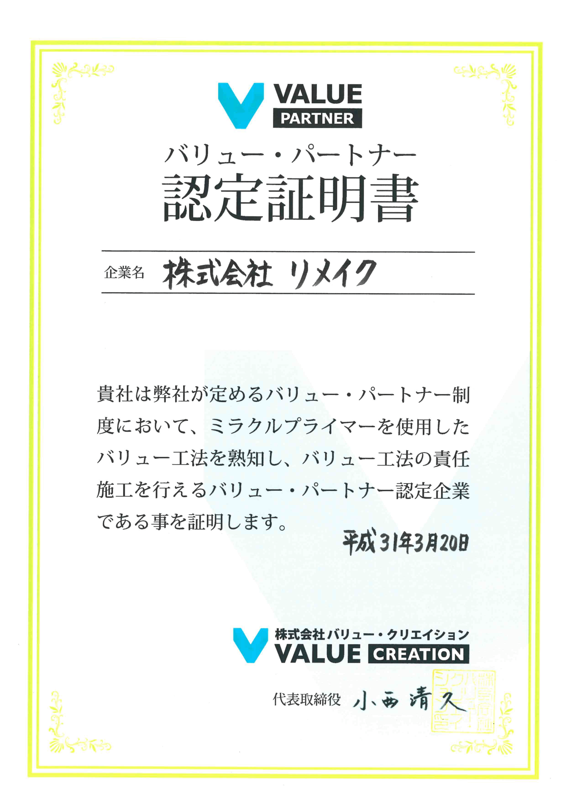 バリューパートナー認定証明書は、ミラクルプライマーが持つ特長や効果を証明するもので、特に漏水防止や腐食防止において高い評価を受けています。ミラクルプライマーは、コンクリートの奥深くまで浸透し、漏水の原因となるヒビや腐食を防ぐための強力な塗料です。また、油や水分があっても施工が可能で、乾燥も早く、工期が短縮されるため、施設の利用者様の負担も軽減されます。バリューパートナー認定証明書は、これらの特長を証明するものであり、施工したお客様から大変評価を頂いています。