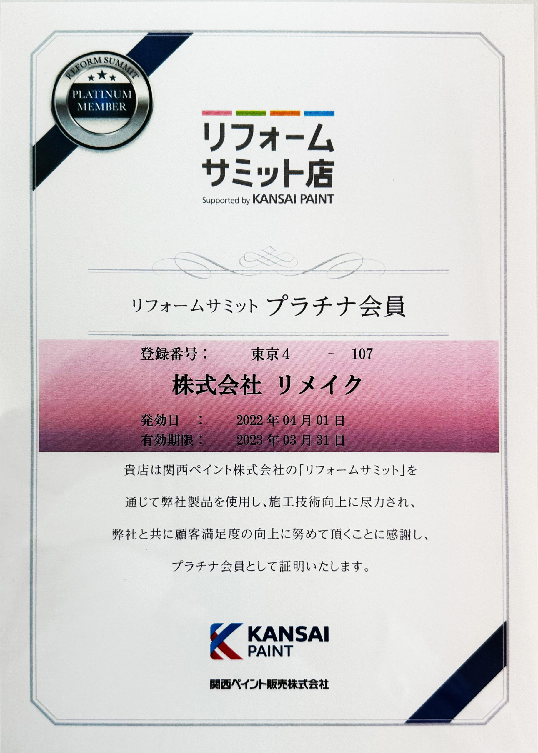 関西ペイントが主催する研修会で、塗装店と連携して技術力やサービスの向上を目指す取り組みです。参加する店舗は、塗装実績や技術、関西ペイントの講習会への参加など、審査基準をクリアした業者であり、特にプラチナ認定店は高品質な塗料を使用できる特別な店舗です、リフォームサミット店では、他では扱えない高機能・多彩な塗料を提供し、顧客との信頼関係を築くことに努めています。