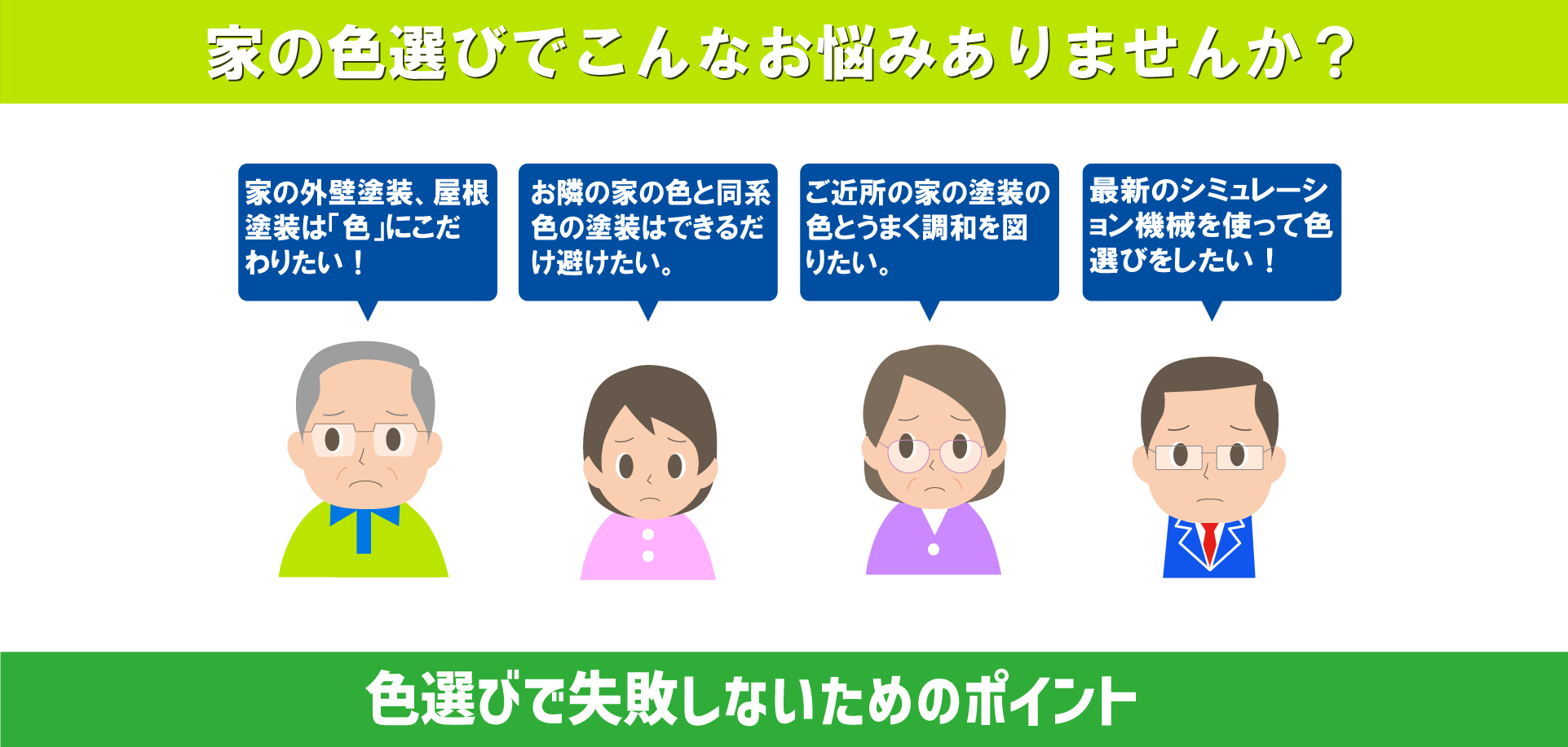 一人で色を選ぶのは、かなり大変です。外壁塗装を行うと、住宅の印象が大きく変わってきます。一人で決めるのはかなりご不安かと思いますので、弊社ではスタッフが寄り添って決めさせていただきます。弊社はベテランで、多くの外壁塗装をみてきたスタッフが多くおりますので実際の施工事例等を参考にお話しすることができます。お気軽にご相談下さい♪