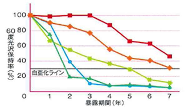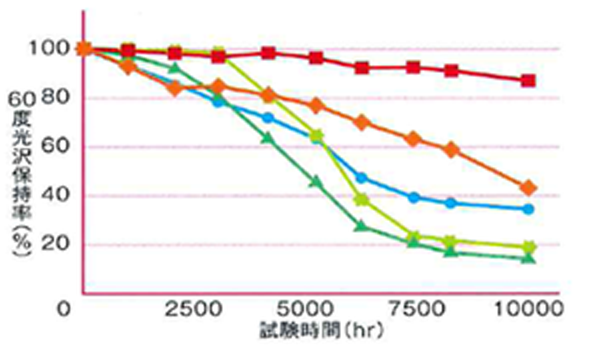 7年間の屋外暴露試験で塗膜に強い紫外線を与え続けても高い光沢を維持します。フッ素樹脂塗料と比較しても非常に高い耐候性を持つことがわかります。