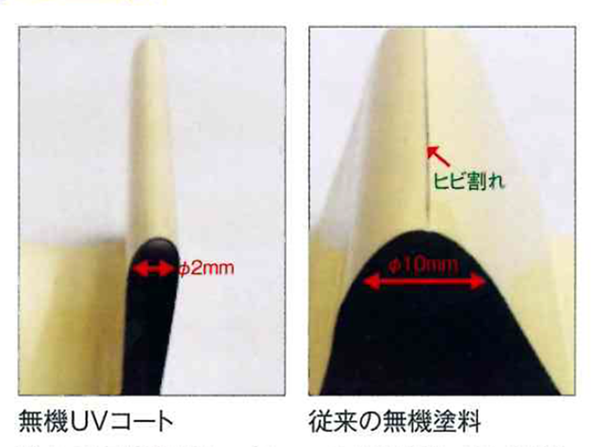 柔軟性がないという、従来の無機塗料の欠点を改良し、強くてフレキシブルな塗膜を実現しています。