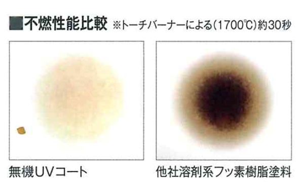 不燃性のため、無機UVコートを塗った面は燃えにくく、火災時の延焼を防ぎます。