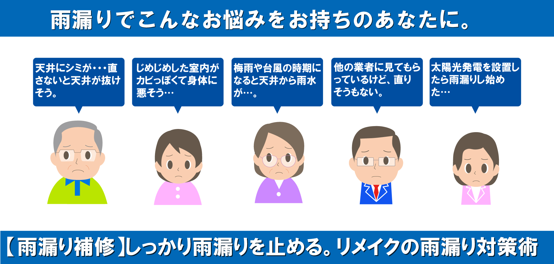 そこでリメイクは少しでもお客様が安心して雨漏り施工に踏み切れるよう、こちらに雨漏りについての情報を公開することにしております。ぜひこちらで雨漏りについて詳しく知り、安心して雨漏り施工を依頼してください。